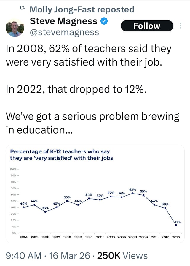 TEACHER’S AREN’T HAPPY: This is an alarming statistic about the plunge in teacher satisfaction rates. You have to wonder if it’s tied to the launch of smart phones since 2008 was a pivotal year when the iPhone came out.