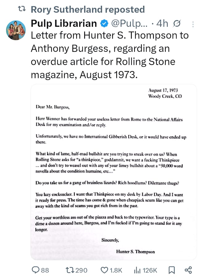 HOW TO ASK A CORRESPONDENT FOR A STORY: “What kind of lame, half-mad bullshit are you trying to sneak over on us?” Hunter S. Thompson provides a template for any editor demanding a writer file a story.