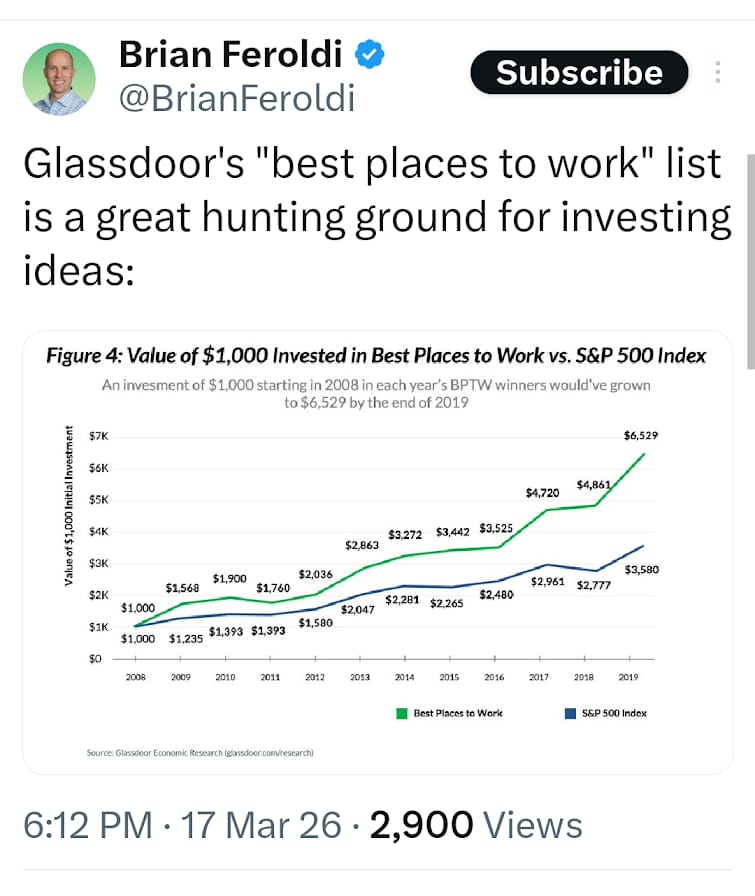 THE BEST PLACES THE WORK: A rare piece of good news - that companies that have been highly rated as among the best places to work are also the best investments.