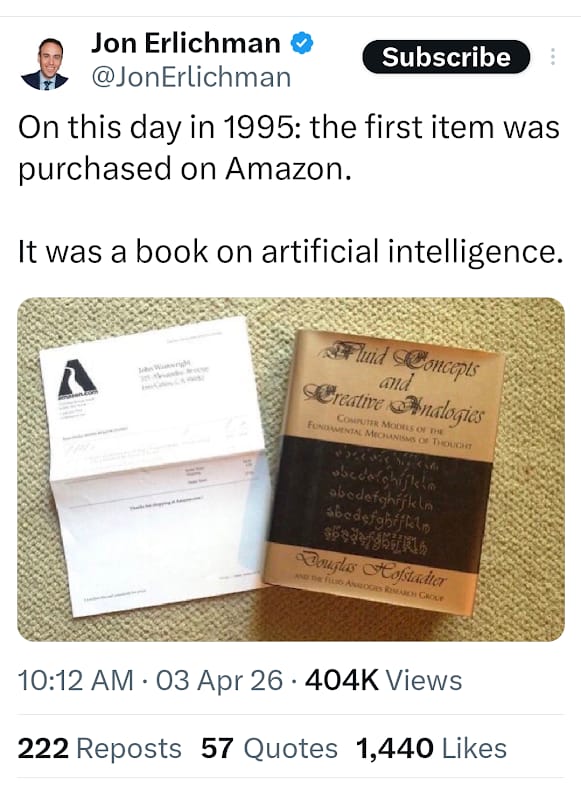 AMAZON: The first sale on Amazon occurred on April 3rd, 1995. It was a book by Douglas Hofstader.