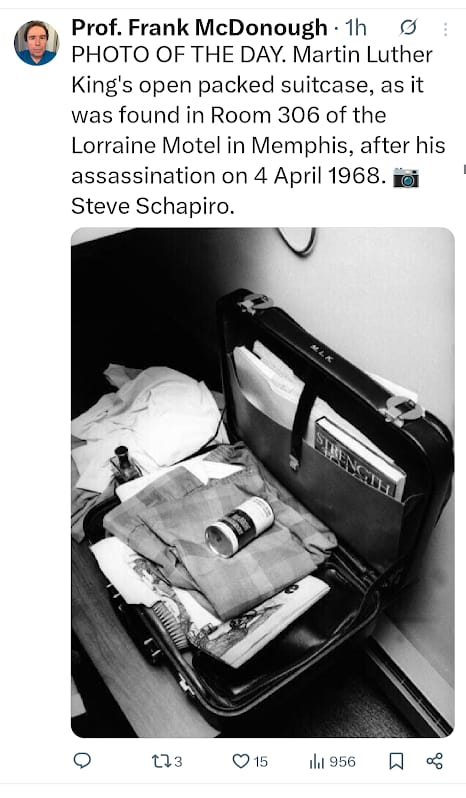 MARTIN LUTHER KING: The photo of MLK’s suitcase found open and packed after he was assisinated is such a poignant image, one that can’t help raise the question of how history might have been different had he not been killed.